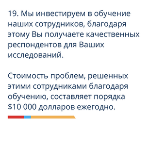 Собственный штат сотрудников. Обучение происходит своими силами с нуля. Рекрутинг респондентов осуществляется без привлечения сторонних партнеров / рекрутеров, таким образом Вы не работаете с посредниками и получаете качественный подбор и успешную реализацию проекта.
