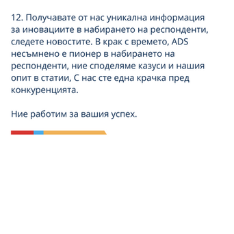 ADS - специализирана в набирането на респонденти от 2013 г., пионер в набирането на респонденти.